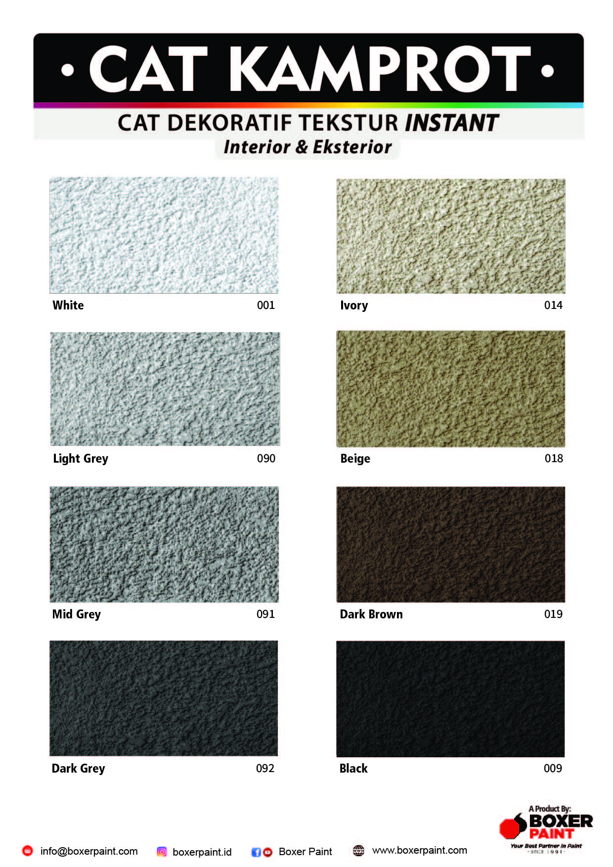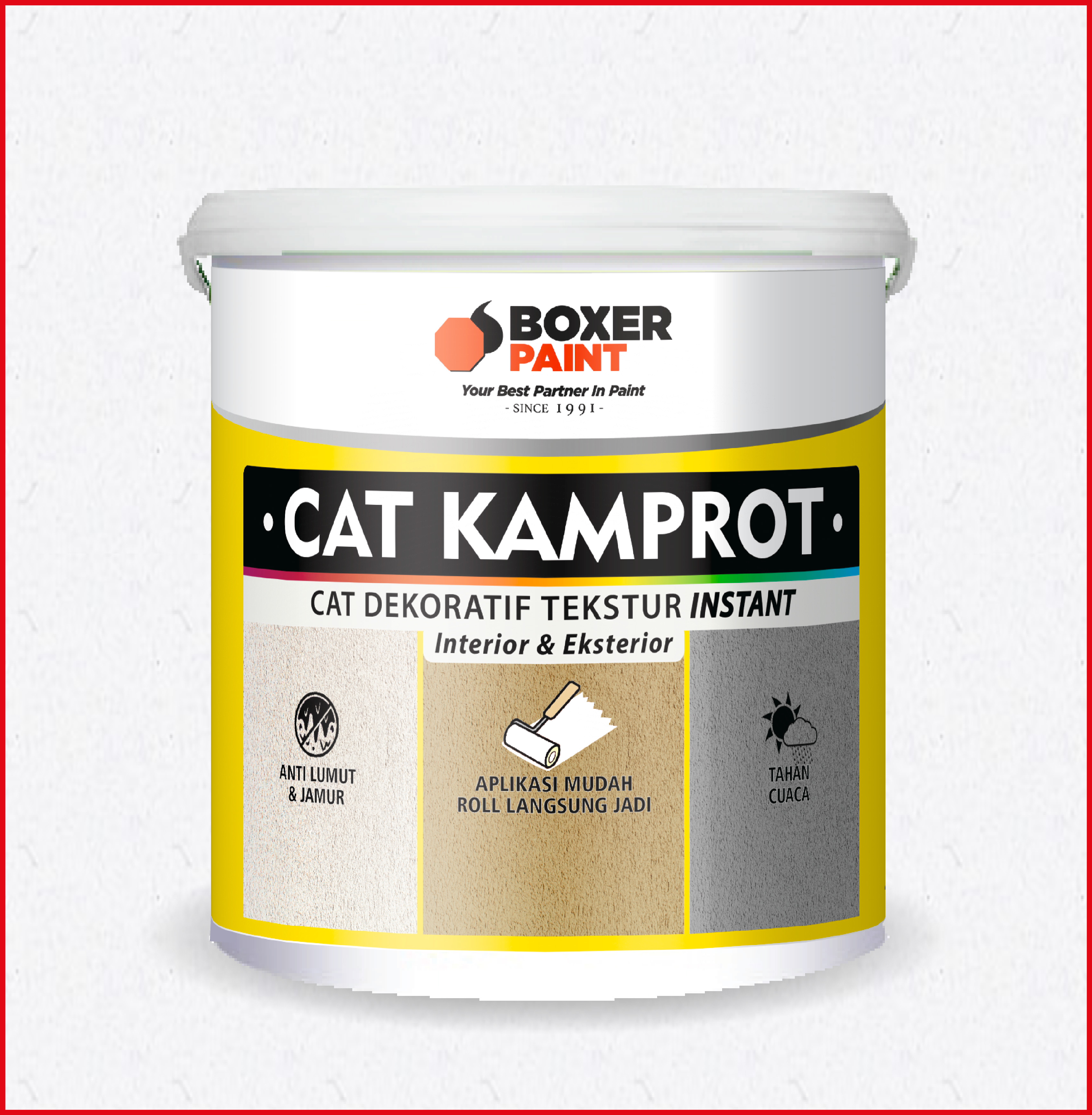 BOXER Cat Kamprot Instant adalah cat tekstur motif berkualitas tinggi berbahan dasar air yang diformulasikan agar mudah diaplikasikan (instant) untuk menambahkan nilai estetik pada dinding. Dapat diaplikasikan menggunakan roller atau spray. Cat ini sudah dilengkapi dengan bahan pilihan sehingga memiliki karakteristik anti jamur, anti lumut, tahan cuaca, cepat kering, tahan lama, dan daya lekat yang bagus. BOXER Cat Kamprot Instant sangat cocok menutup retak rambut pada dinding, dan untuk menyamarkan dinding yang bergelombang.