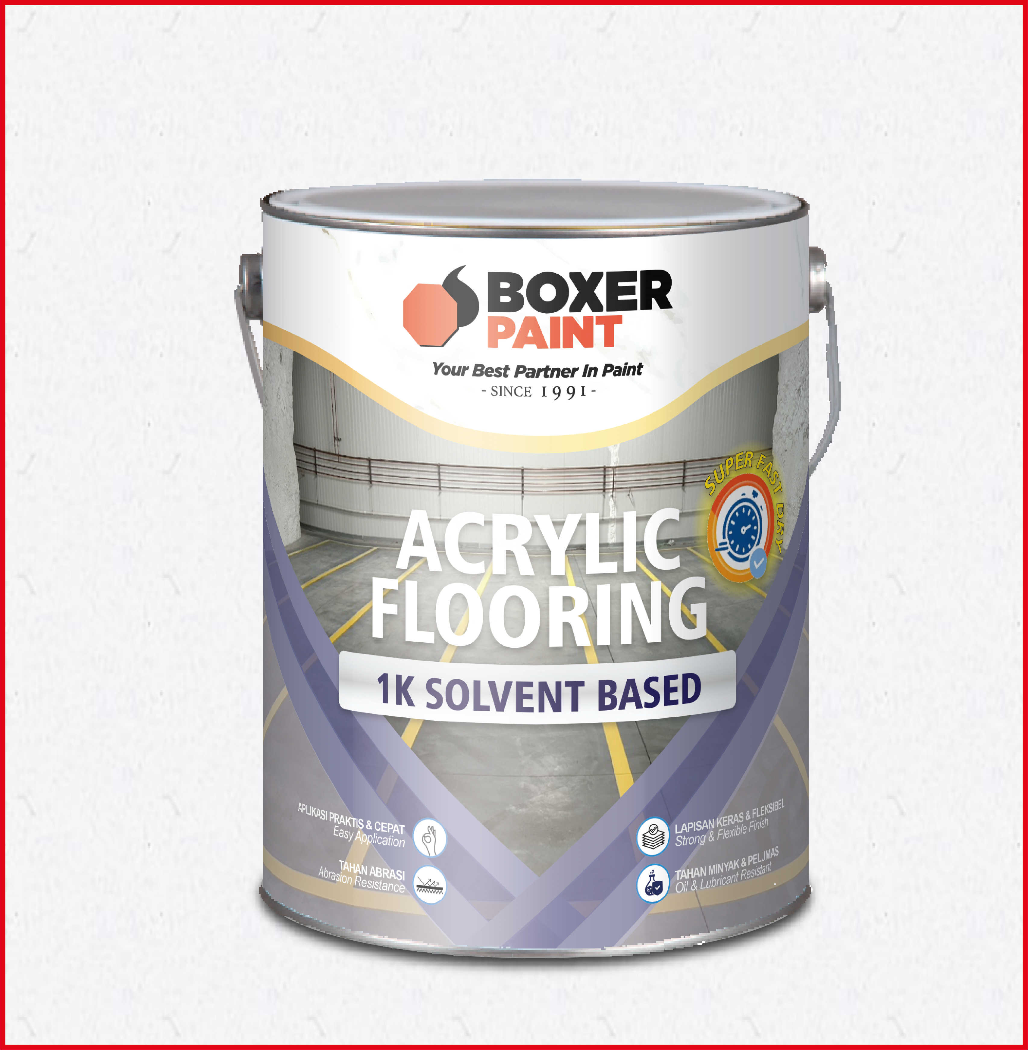 BOXER 1K Acrylic Flooring Paint SB adalah cat khusus lantai berbahan solvent based 1 komponen. Penggunaan sangat praktis, sangat cepat kering, dan menghasilkan lapisan yang keras dan fleksibel. Memiliki ketahanan abrasi yang bagus, dan juga ketahanan yang bagus terhadap minyak dan pelumas.